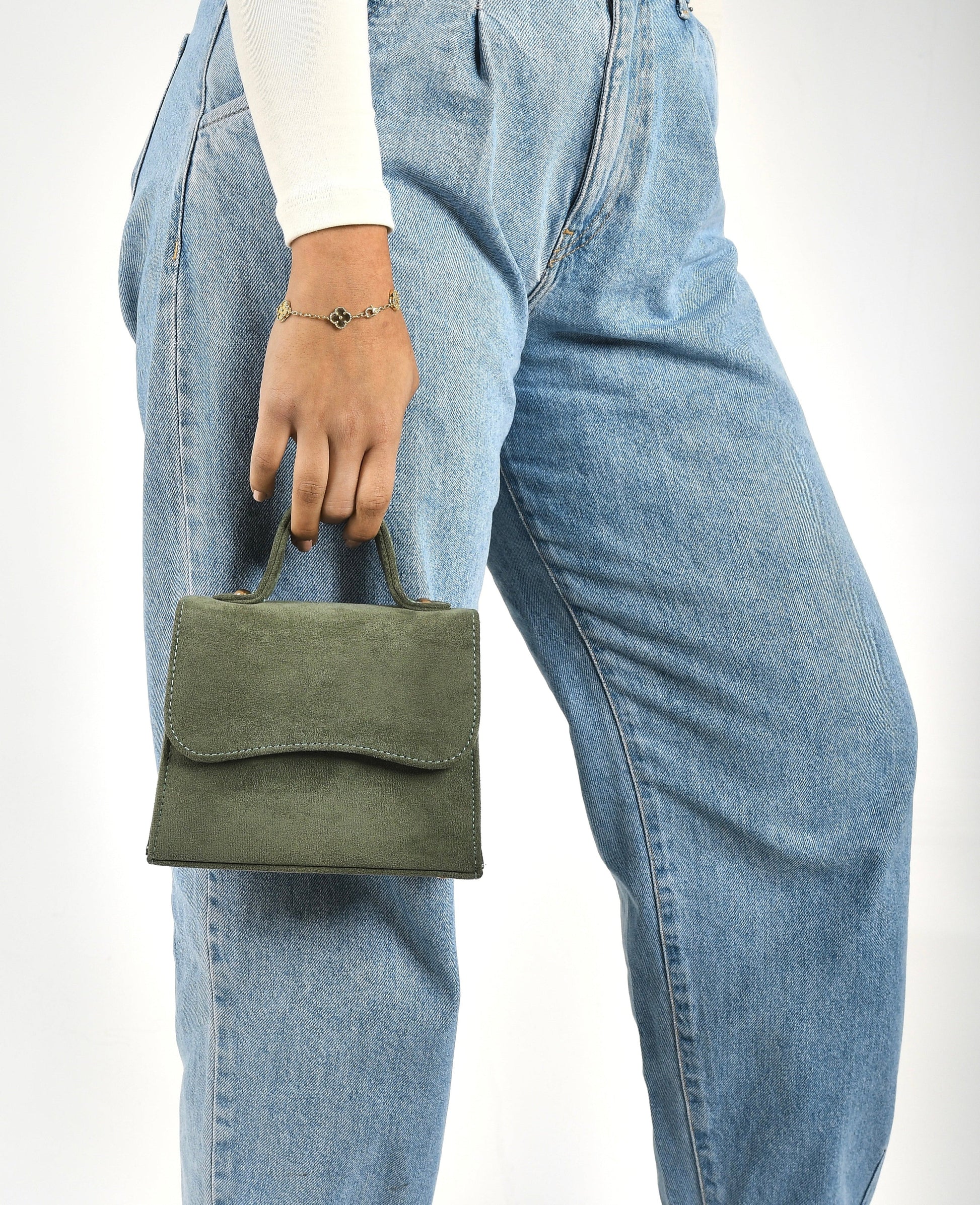 Features a magnetic flap closure and an adjustable strap made from the same velvet leather for a seamless, polished look.